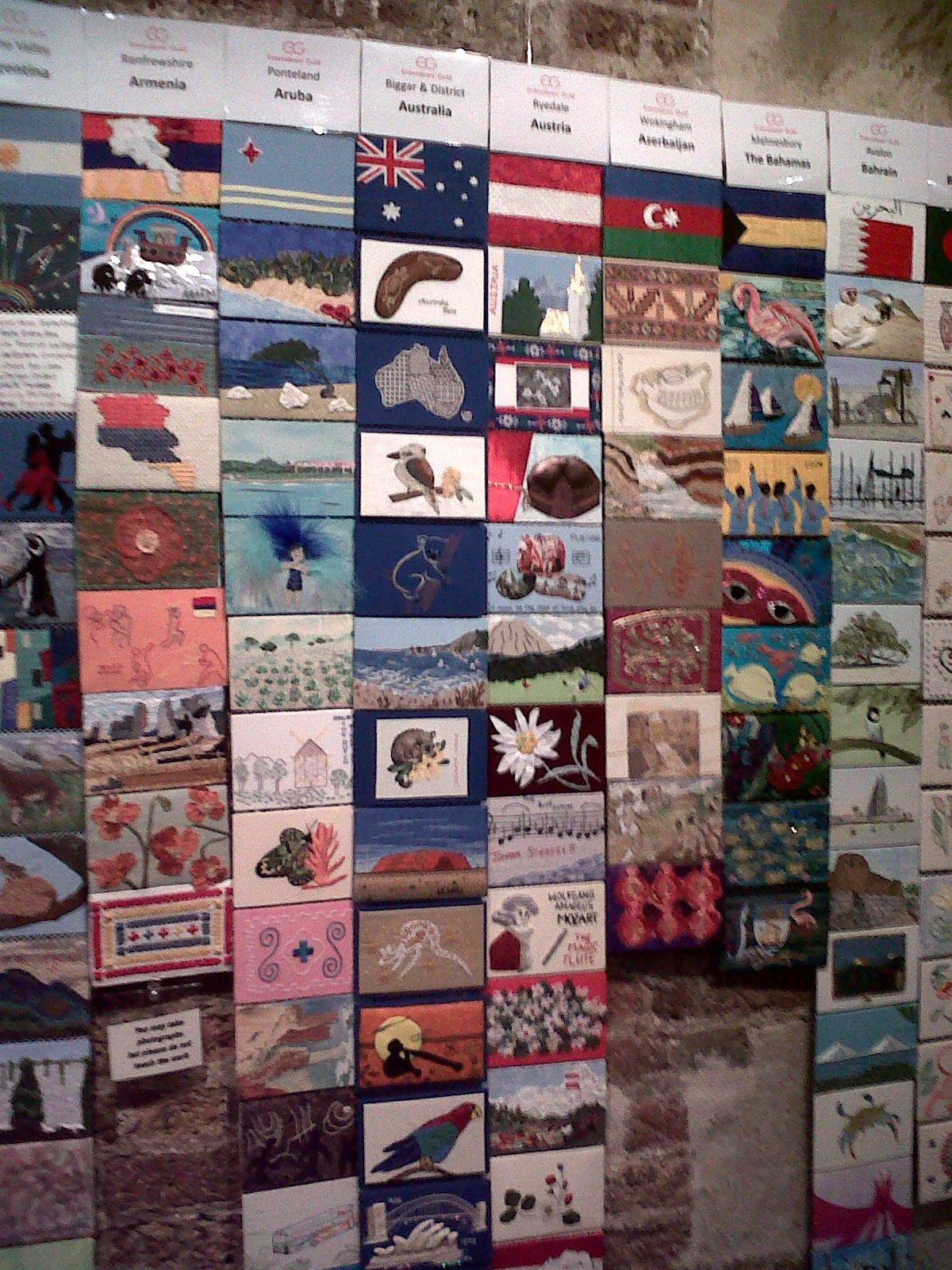 Now totally stuffed we wandered down to Trafalgar Square – saw a couple posing in their wedding finery with a red London bus – and then went down to the crypt in St Martins in the Field, the church opposite the square. On display was an exhibition of embroidered pictures made by all the different guilds in the UK to celebrate the Olympics – embroidered pieces of every country that took part – spot the Australian strip.
