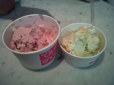| Ken’s cherry yogurt with white chocolate stars & my green tea yogurt with shaved coconut |