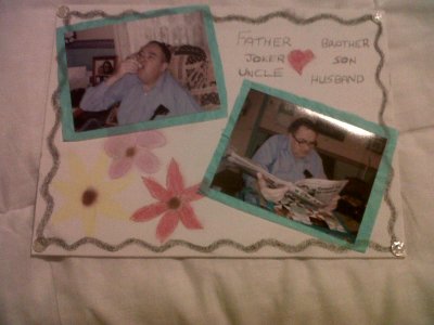 We both used pictures, Ken one of his parents that we love, and I used two of Dad that were taken in the weeks before he died, including a picture of him trying an oyster for the first time in his life – better late than never!!
