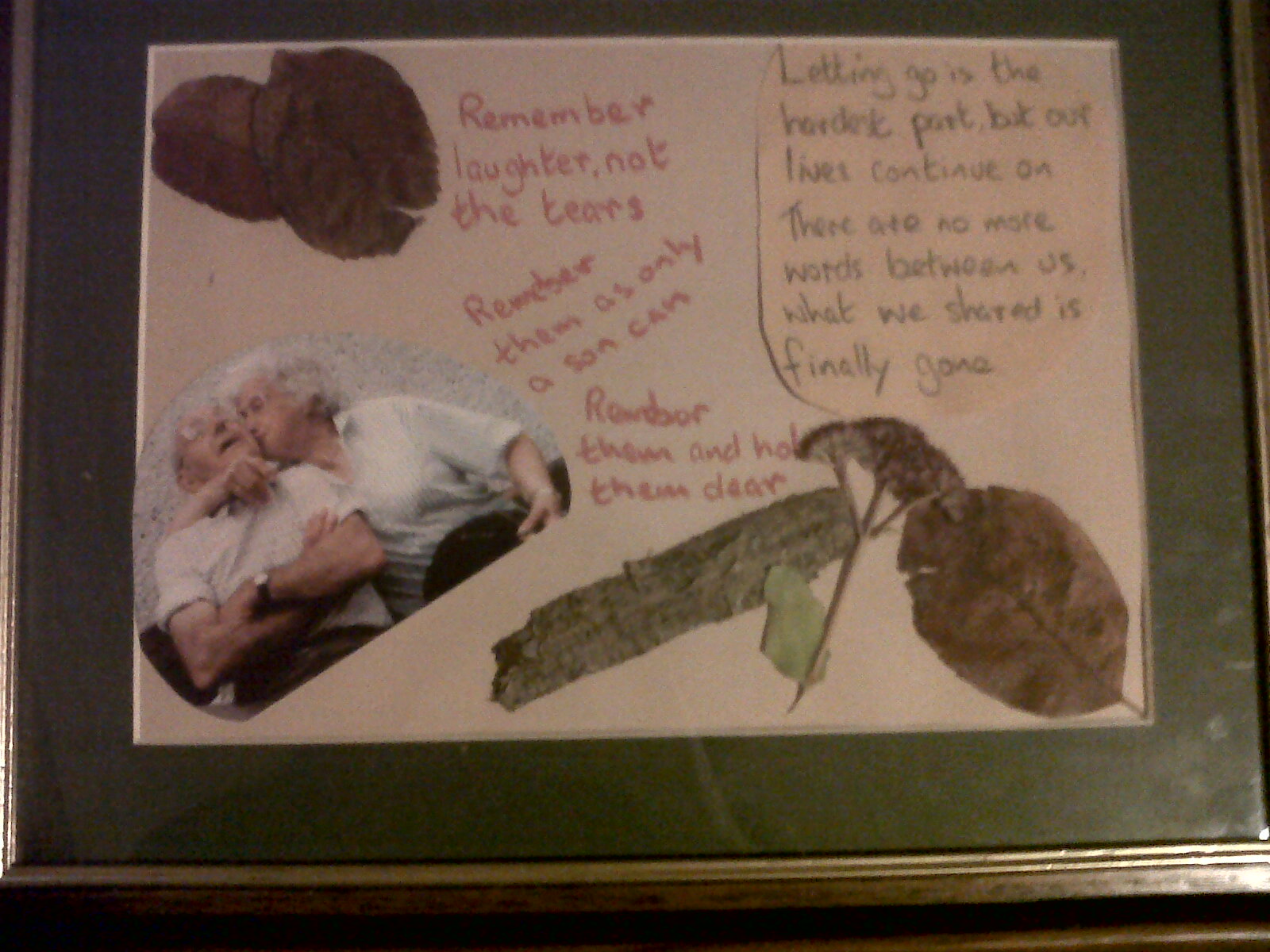 During October they held a festival in and around Oxford called the Kicking the Bucket festival – a celebration of life and death. I booked Ken and me onto a craft workshop called making memories, not knowing quite what to expect. We were told we could bring photos, poetry, or anything else we may want to use in our craft. The session was facilitated by an art therapist, going for two hours, and there were only 4 other participants so it was a really safe environment . I wasn’t sure if Ken was just attending to humour me, but once we got there he threw himself into the experience being the first to introduce himself and talk about the death of both his parents.