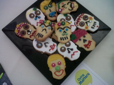 The following Thursday – Nov 1st which is the Day of the Dead (festival held in Mexico – look it up as very interesting) I spoke at the National Celebrating the Day of the Dead event in London about what we did at work for Dying Matters week earlier in the year. Needless to say I was extremely nervous but really proud of myself for doing it. The whole event was so motivating and interesting, and the organisation was great – we had skull shaped biscuits on the tables, table centres designed by one of the local schools, margaritas and Mexican food after the event along with a wandering musician.
