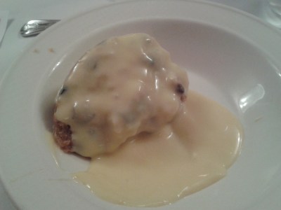 It’s a fantastic evening with a great atmosphere – the evening is chaired by the pudding master who explains what is happening and tells you all about each pudding before we even get into the dining room. His main bit of advice was that when we had our mains to go easy on the vegetables, so I did just that, having my chicken with mushrooms and nothing else. There were over seventy people there that night, all ready to celebrate puddings. Once everyone had eaten their mains, the parade of puddings commenced, with each pudding being introduced and walked around the dining room to a round of applause.