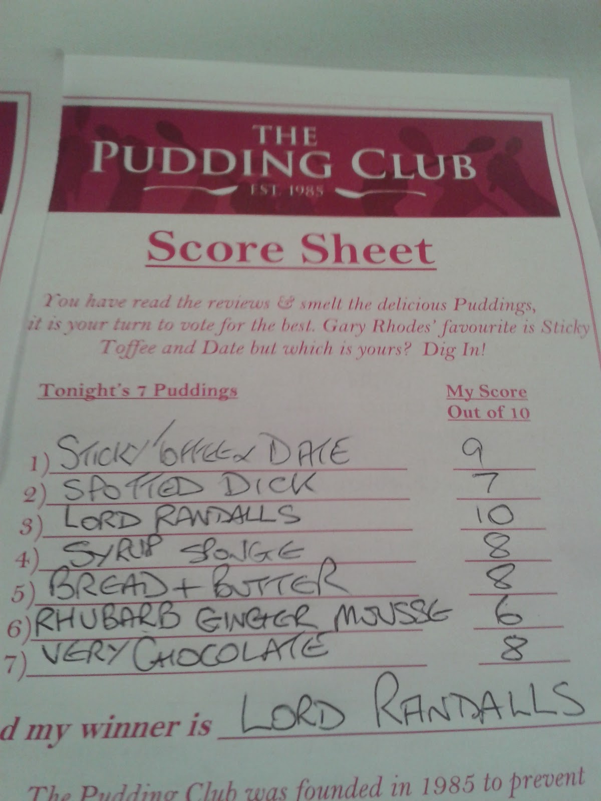 During the evening you are given a score sheet and you have to give each pudding a score out of ten, and then say which was your winner overall. Below are mine and Ken’s score cards, and as you can see we had some very different views on the puddings.