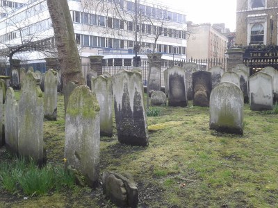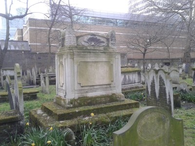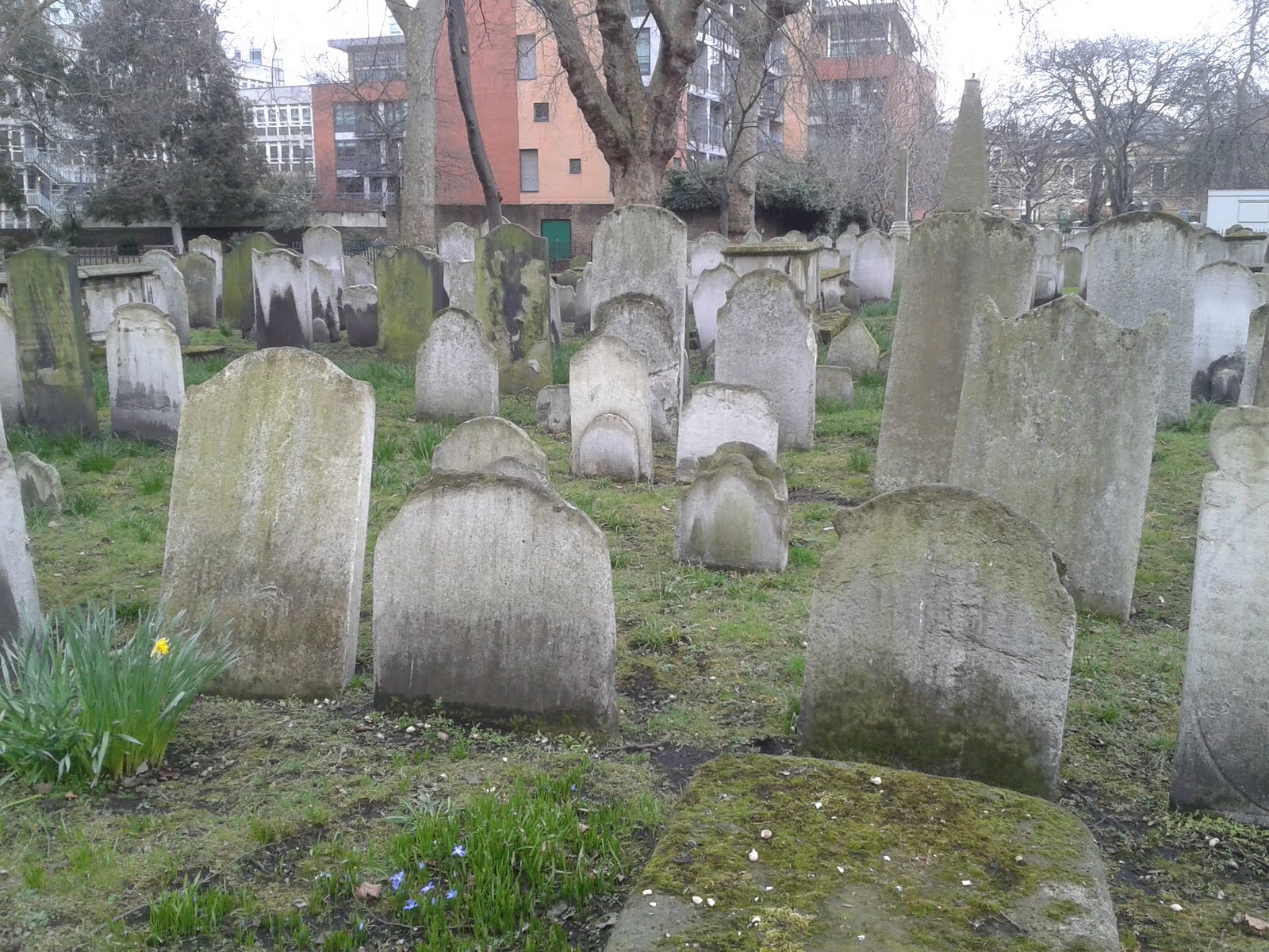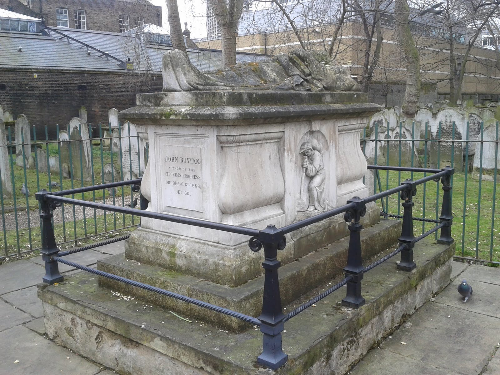 Yesterday we decided to risk the very fickle weather we’ve been having lately and head into London – when we left home the sun was trying to shine through the clouds and there were a few patches of blue sky. Our destination was Bunhill Fields burial grounds – it’s located north of St Pauls and covers 1.6 hectares. It’s believed to date from the 1600’s and a couple of notable people buried there are John Bunyan (Pilgrims Progress author) and Susanna Wesley (mother of John and Charles).