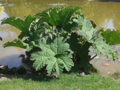 | If you look closely under the leaves, you will see a mother duck hiding from the sun with her babies. |