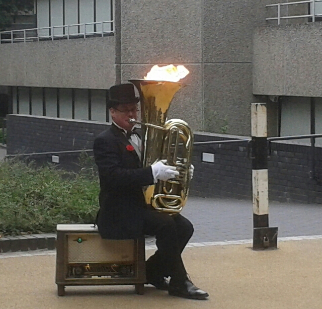 | Street performer – every time he blew into his tuba flames shot out the top |