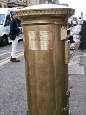 During the London Olympics any UK athletes who won a gold medal had a post box painted gold in their home town – Sir Chris Hoy the cyclist has two in Edinburgh and we happened upon this one.
