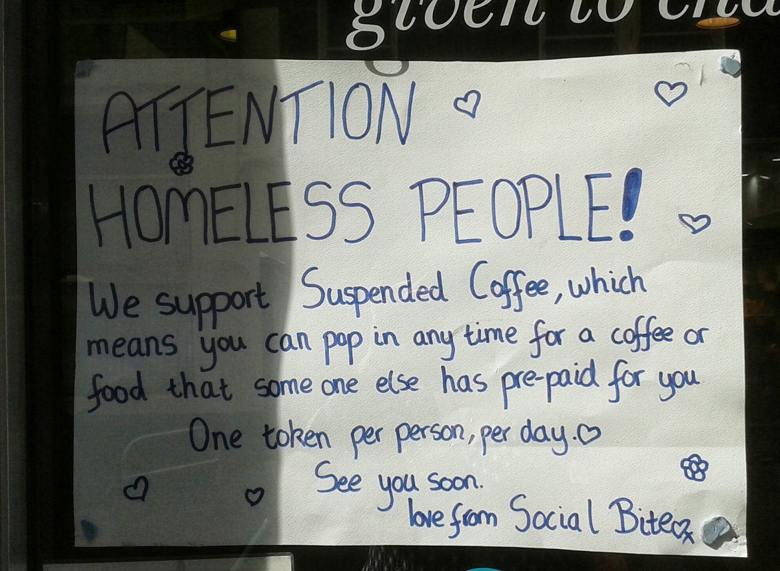One of the nicest things we saw was the below sign in the window of a cafe – really warmed my heart and restored some faith in the human race.