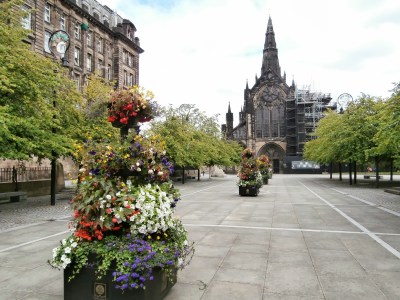 The area around the necropolis has some great architecture, especially in cathedral square – we loved the street lights with the fish, tree, and bell. The flower pots are very colourful and obviously looked after well.