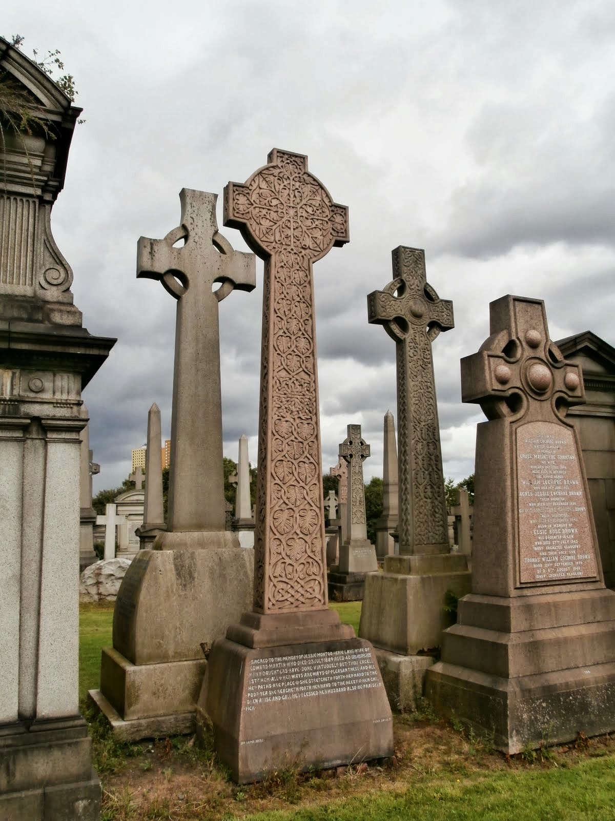 As you wander round you read lots of interesting epitaphs, and see some amazing carvings on the headstones and memorials. One of the most popular themes is the Celtic cross and Celtic patterns – a selection of memorials below.
