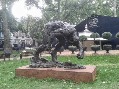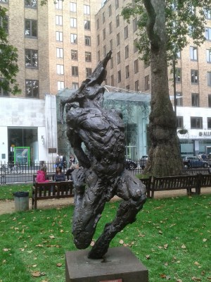 Later in our walk we stumbled across an antiques and fine art fair that was being held in Berkeley Square (the one where the nightingale sang) and these sculptures below captured our attention. They are humans with animal masks, and some animal features as well – it was all about our inner animal, apparently.