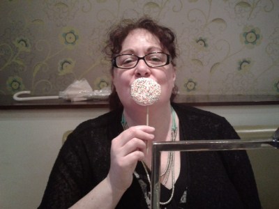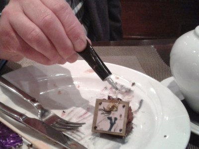 One of the mini cakes was chocolate and it came with a little tube of Orange stuff – very cute. We shared all the cakes by cutting them in half.