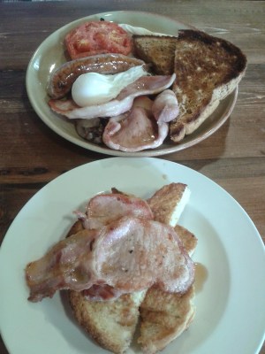 | Ken’s belly buster full breakfast and my French toast with bacon and maple syrup – yummy! |