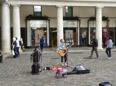 Our next mission was to find our usual day out treat – you guessed it, coffee and cake. We walked through Covent Garden where there are always street performers and buskers – the girl below was very good. I was watching her perform while Ken had found a car to perve on.