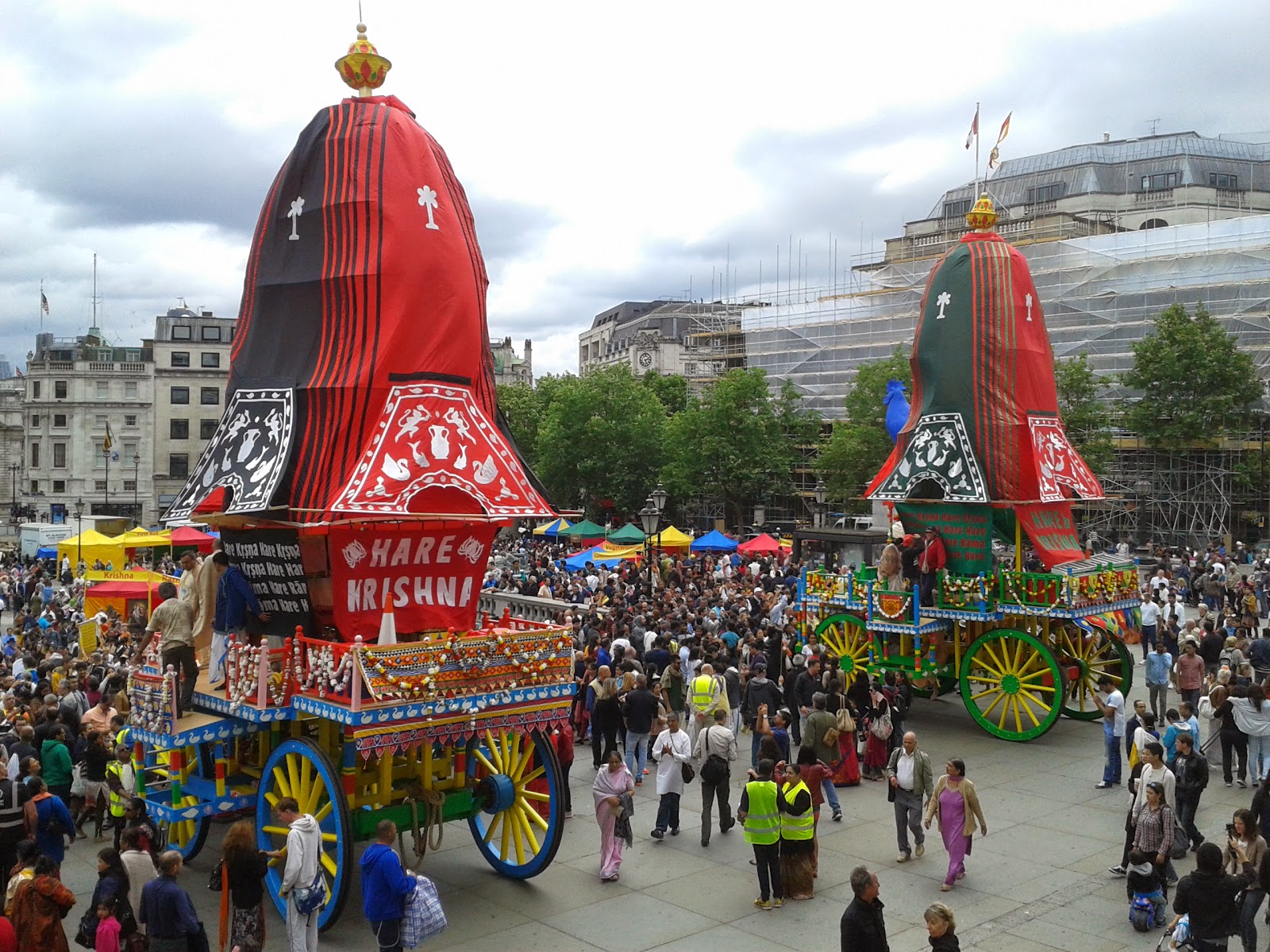 When we came out of the gallery, seemingly out of nowhere three very large carriages had appeared – when we got home I googled the event to discover that the celebrations were for Rathayatra which includes the chariots. This was the 46th celebration in London and the chariots had travelled from Hyde Park Corner to Trafalgar Square accompanied by people singing and dancing in the streets.