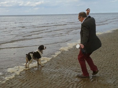 Bertie got to sniff and be sniffed by lots of dogs including a very cute Cocker Spaniel and a gorgeous French Bulldog – he also got put in his place by a Boxer who dunked him under the water. Once we were sure he knew where we were we let him off the lead again and then him and his daddy had some fun.