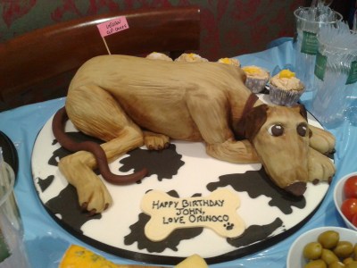 That afternoon the three of us had been invited to a birthday party and despite our mood we decided to still go – it was the correct decision as Bertie loved all the attention and as the birthday boy is a mad dog person as well, there were lots of dog treats to tempt our poorly boy with, and he got to sniff lots of other dogs bottoms. The birthday cake was amazing – designed off a photo of their dog Orinoco.