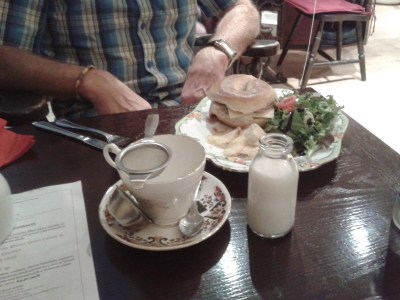 The food was lovely, and a bit like the furniture the crockery was vintage and gorgeous. We had bagels to eat and then my beloved indulged in a piece of red velvet cake – without asking the waitress brought us two forks, so I had to help him eat it.