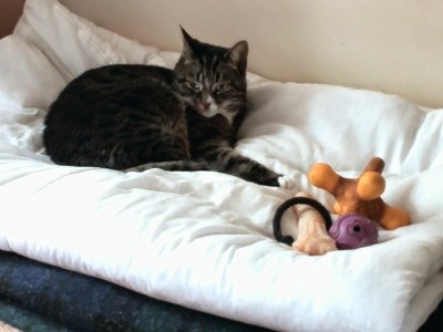 P.S: Photo that Ken took of Princess Cookie sleeping on Bertie Boo’s bed with his toys.