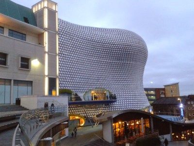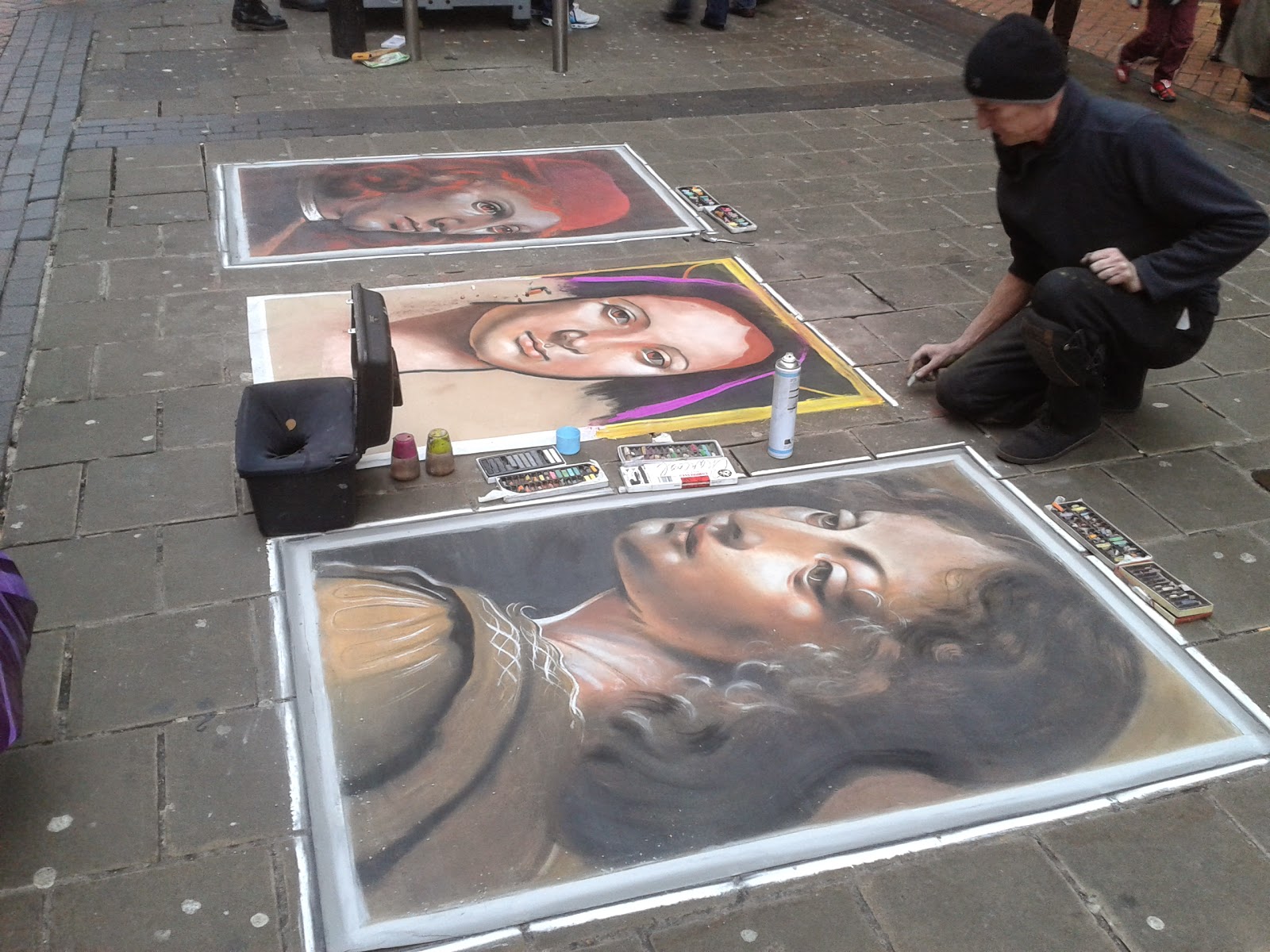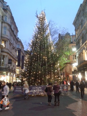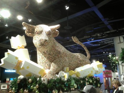The stalls are in the streets around the Bullring, which is the big shopping centre in Birmingham. Even the bull was dressed for the season.