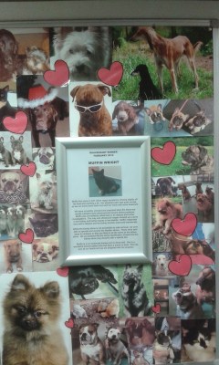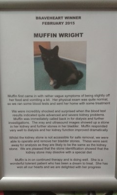 Now for the reason for our staycation (sorry Ken). Our little Muffin Monster had been in hospital and had to have surgery – she’s much better now, but we did have several sleepless nights as well as many tears. During our week off we were very proud to discover that Muffin had been given the braveheart award at our lovely vets. Her picture and story are up on the wall for all to see.