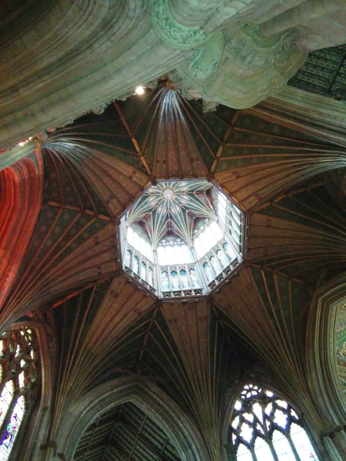 The above picture is looking up into the Octagon, which we were lucky enough to be just in time for a tour up onto the roof and inside the upper part of the Octagon who’s central height is 43 metres. To get up to the roof there were lots of very narrow winding stairs and then finally a doorway that was probably only 5 feet high, and only 18 inches across (apparently). Now I’m not sure if you’ve noticed from any of the pictures of me, but I am not 18 inches in any direction!!! On the way up I seemed to squeeze through somehow, but on the way back down the laws of physics kicked in and I thought they may have to get a helicopter to airlift me from the roof as my body was not going through the doorway no matter how I manipulated – luckily my beloved wasn’t adverse to a little shoving and I eventually popped through.
