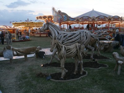 At the end of the day we walked through the fairground which was set up across the road – I love the old fashioned merry go rounds lit up at dusk. I was also loving these gorgeous driftwood horses – wishing that we had room to put on in the flat as I’m sure the cats would love it.
