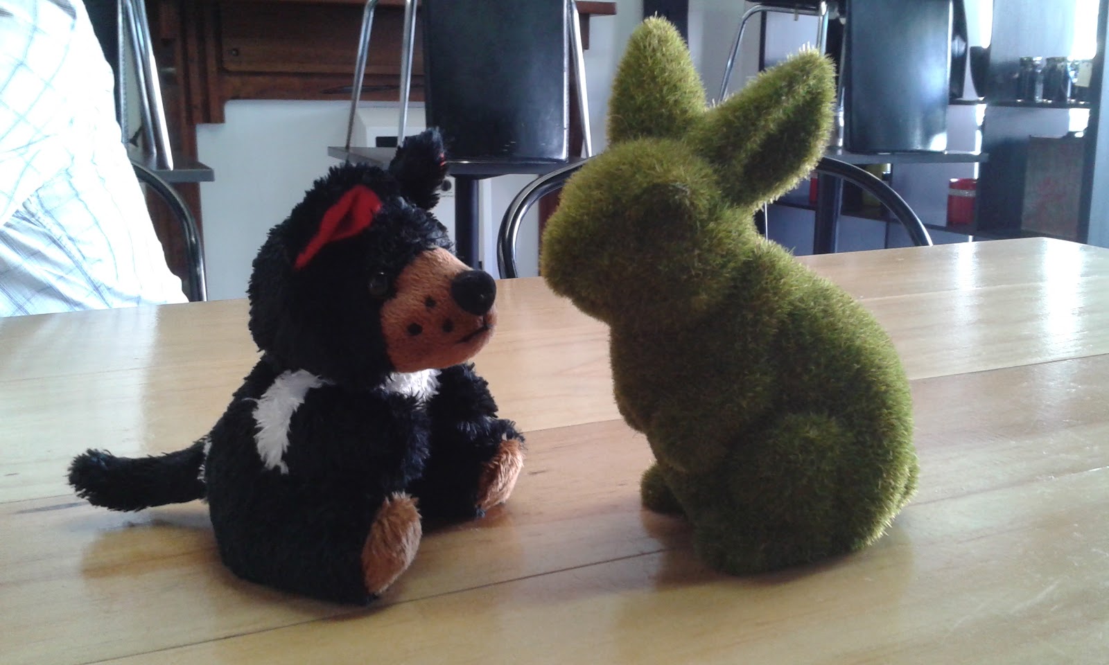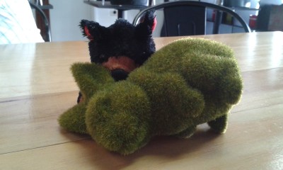 Crumble made the acquaintance of one of Rumours rare green rabbits.