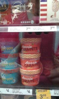Here is another interesting find in the local supermarket – I love caramel ice cream, I love vegimite on toast, but in what universe would you want to eat caramel and vegimite together in an ice cream??? Cara-mite ice cream – #!@!#.