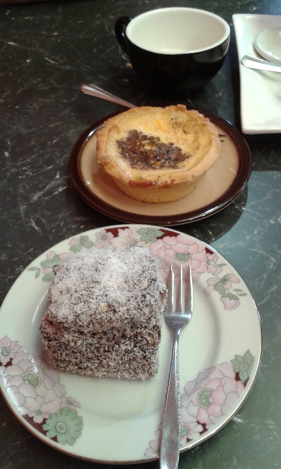 Of course we had to stop for coffee and cake – traditional Aussie food, a lamington for me, and a custard tart for Ken.