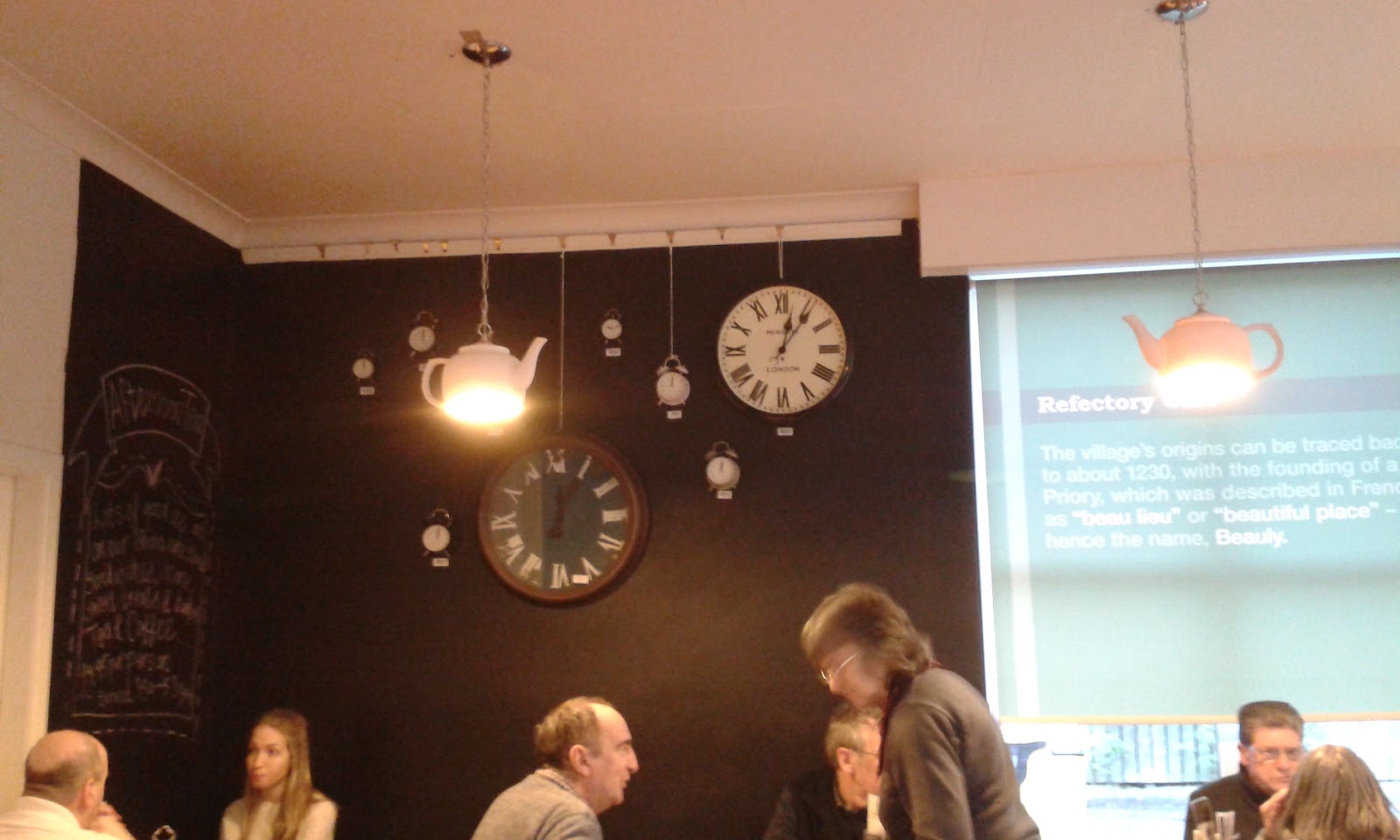 We found a lovely cafe in a place called the Old School – it’s a gift shop with the cafe at the back. I loved the view across the table (my beloved) and the decorations, especially the teapot lightshades.