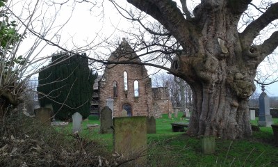 Arty shot of the ruins, headstones, and old trees.