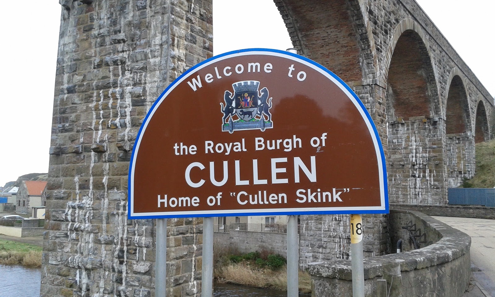 Today we drove east along the coast to Cullen, which is, as the sign says, the home of Cullen Skink – a very thick fish soup with smoked haddock and potato. The sign is under the old railway bridge, which is now part of the coastal walking track.
