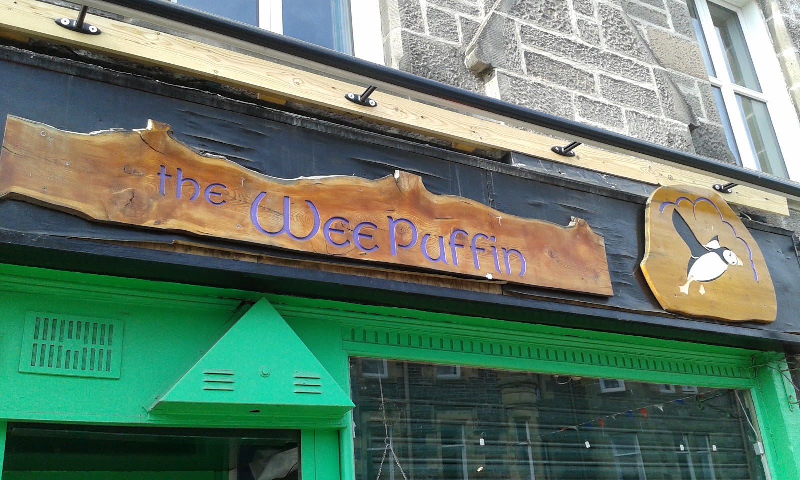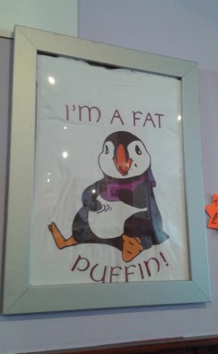 By now it was time for a lunch break and we discovered this cafe/restaurant, the Wee Puffin. There are puffins all around the cafe and there are several puffin themed meals on the menu. They also have a fat puffin challenge that people can take on, a bit like man vs food, but so far they only have one person on the successful board, and many people on the failed board. If you win you get the below t-shirt and your meal for free – I don’t think either of us could do it but my beloved thought that maybe my brothers might be able to.