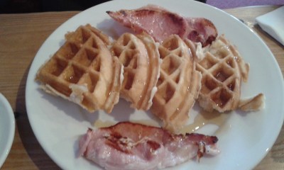 For lunch I had the Puffin Balls (see below) and before any of you panic about cruelty to puffins, they are actually balls of haggis – no puffins were harmed in the making of this dish. Ken fell off the sugar wagon and had waffles with bacon and maple syrup!!