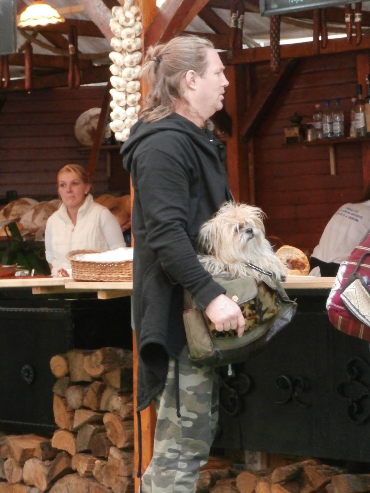 It may be a man carrying a mini wookie in his bag as he wanders around a market (I know it’s not a wookie, but it’s very cute whatever breed of dog it is).