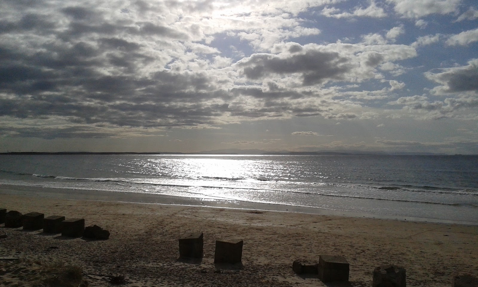 About the middle of this picture there is a bit of wood sticking up through the sand, which is in line with several bits of wood which we think are posts of some sort. Guessing that they’re also part of the old defence system.