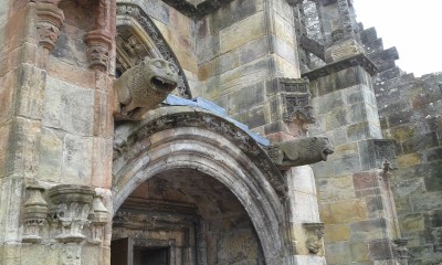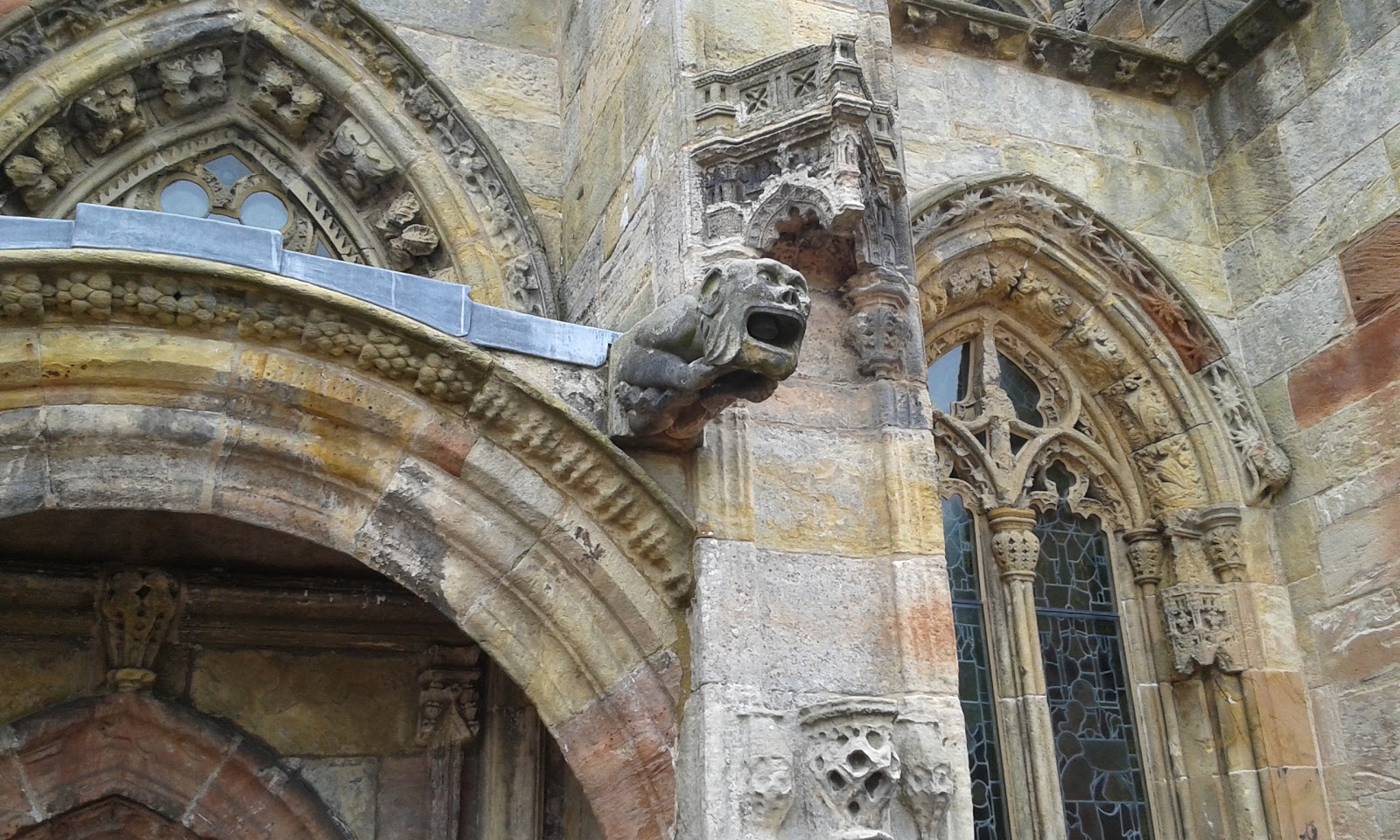 It’s actually smaller than I expected, but still incredibly beautiful and fascinating.  Unfortunately we weren’t allowed to take photos inside so you just have to take my word for how incredible the carvings are.  Also, there is a lovely chapel cat who was curled up on one of the pews, not at all bothered by all the tourists around, and letting us pat him as we went past. The outside of the chapel is just as beautiful and there were lots of interesting faces gazing down on us.