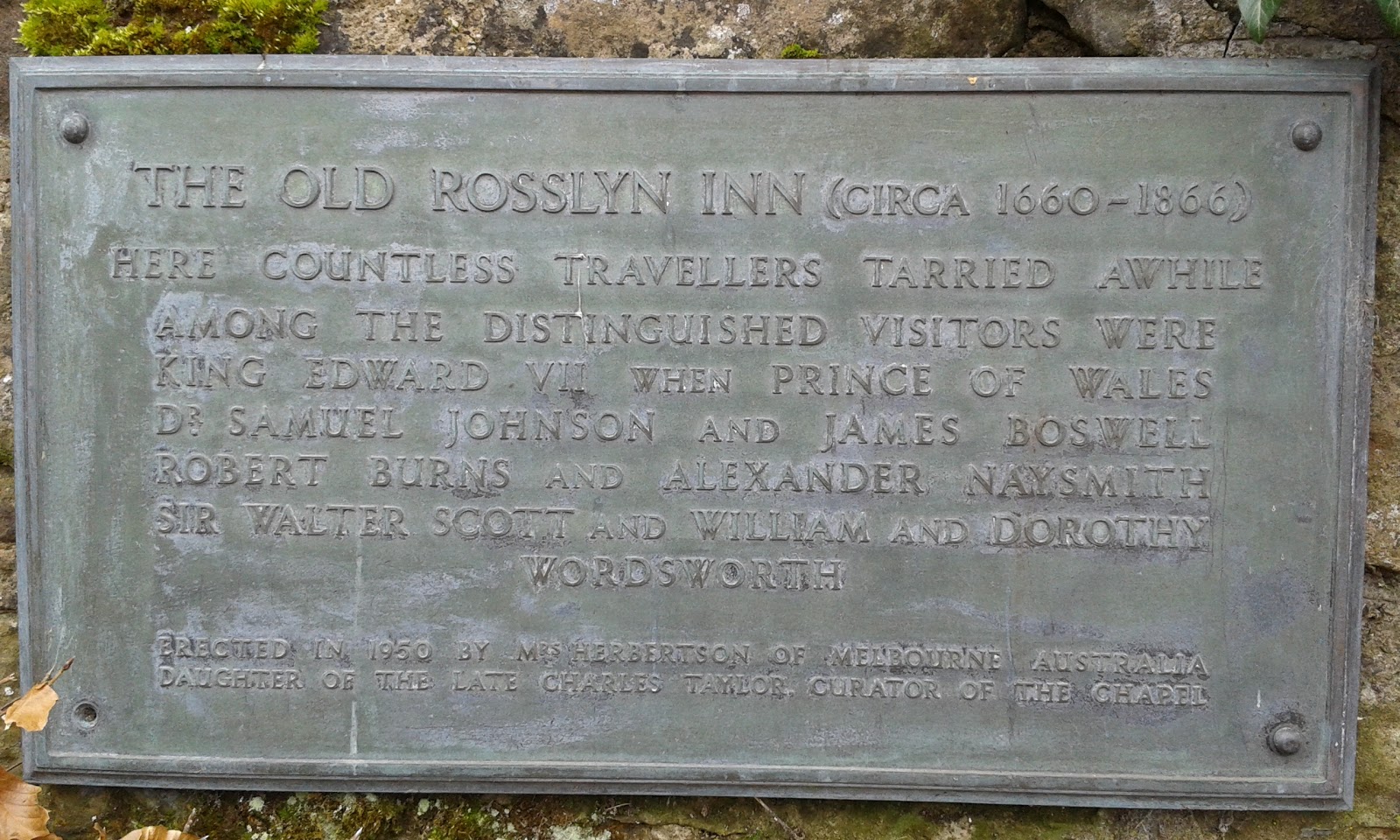 The next place we visited was Rosslyn Chapel – anyone who has read Dan Brown’s The Da Vinci Code will have heard of this fascinating building, as it is a big part of the story. Outside the visitor centre is the Old Rosslyn Inn which as you can see from the plaque had some interesting visitors including the Prince of Wales (not the current one) and Dr Samuel Johnson.