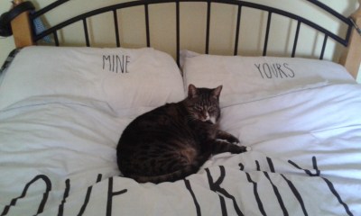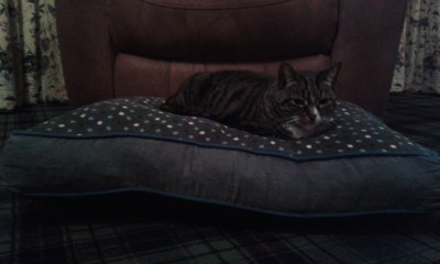 If we leave our bedroom door open the bed becomes the brats property as well – they usually sleep under the duvet but Cookie also likes to sleep right in the middle of the bed as if it’s hers. I obviously need to by a third pillow that says ‘Cookie’s’.