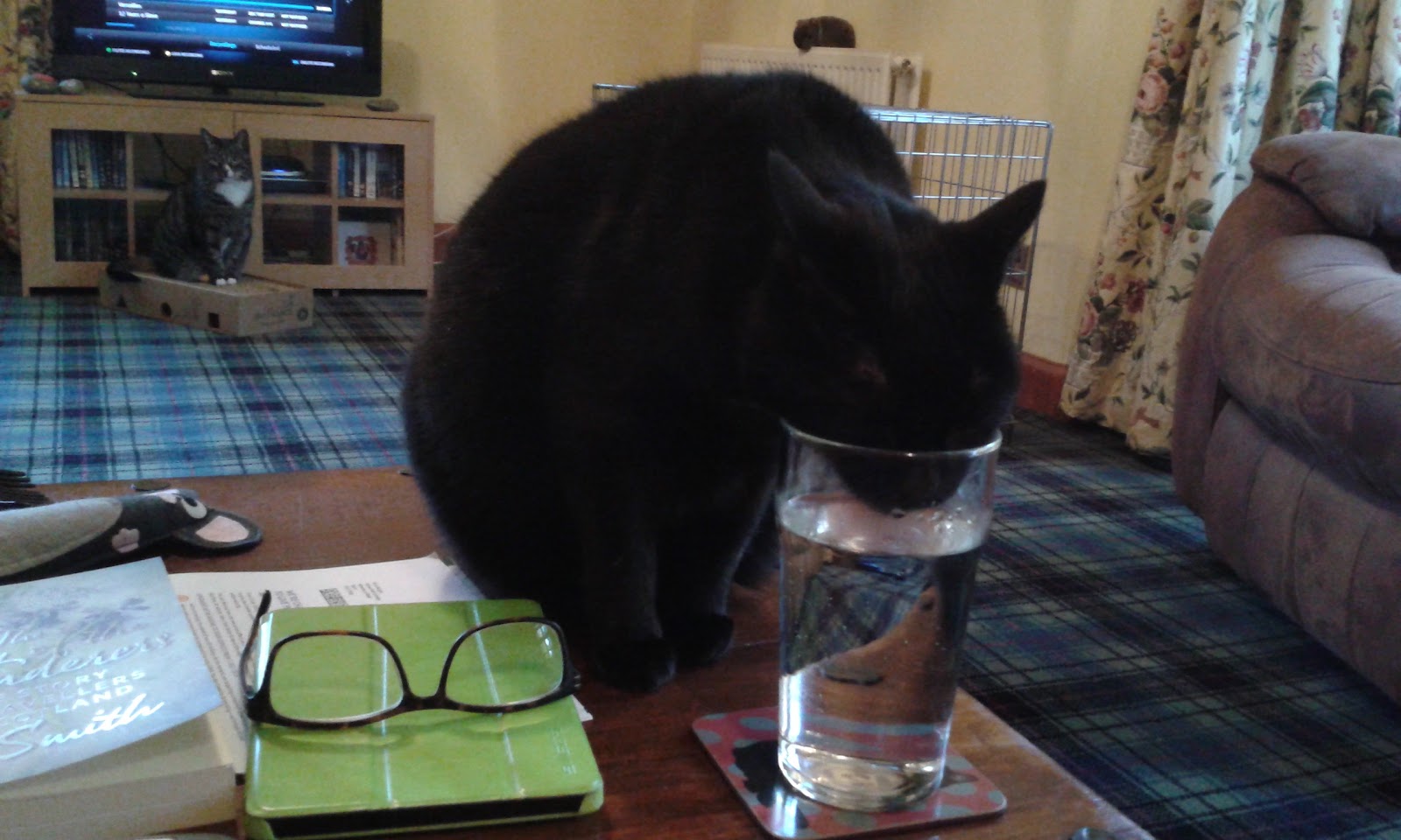 The brats think they own the place and Muffin’s latest little foible is drinking out of Ken’s glass when he leaves it unattended (it’s only water). We normally stop her but I couldn’t resist getting a photo of her doing it.