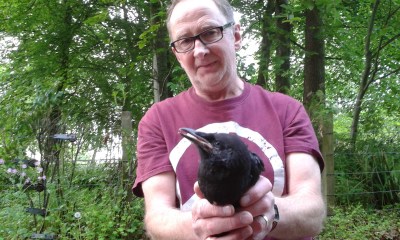 With all this talk of our furbies I thought I’d just show my beloved being a hero again (if you read the previous post you would of seen him rescuing a bunny rabbit). We live underneath a rookery and lately the babies have all been fledging, with varying degrees of success. This silly bird decided that a good place to sit was on the road outside our cottage so Ken caught it and put it in the woods – hopefully it will survive.