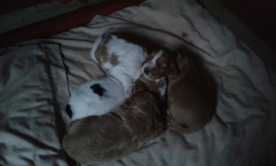 When we first met Bramble she was only 3 weeks old and curled up with her two sisters and one brother. We were the first to get a pick of the litter and we both were drawn to her straight away – she’s the one on the right of the picture with the white stripe down her face. At that stage we didn’t know that she had white on her paws or belly as we weren’t allowed to pick her up. We did get to meet her mum and she is such a lovely dog.