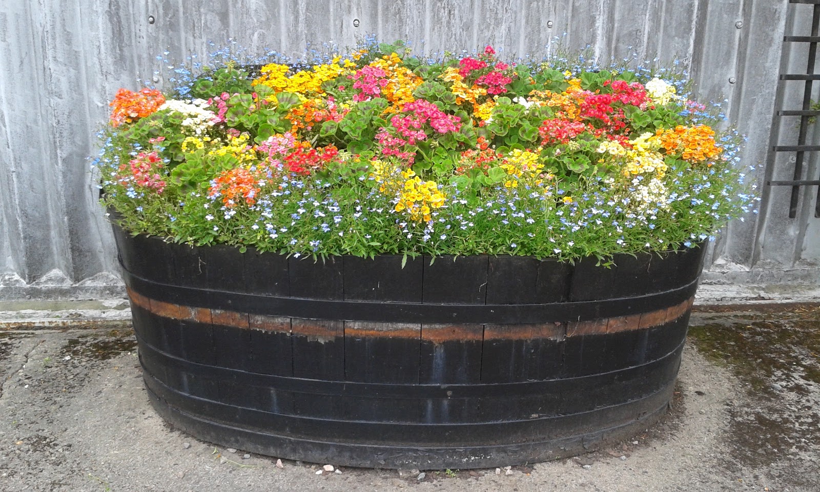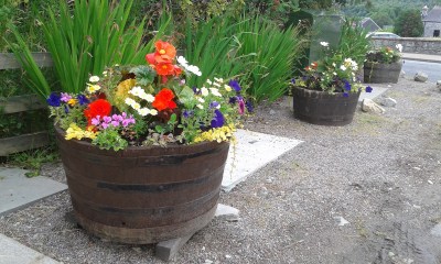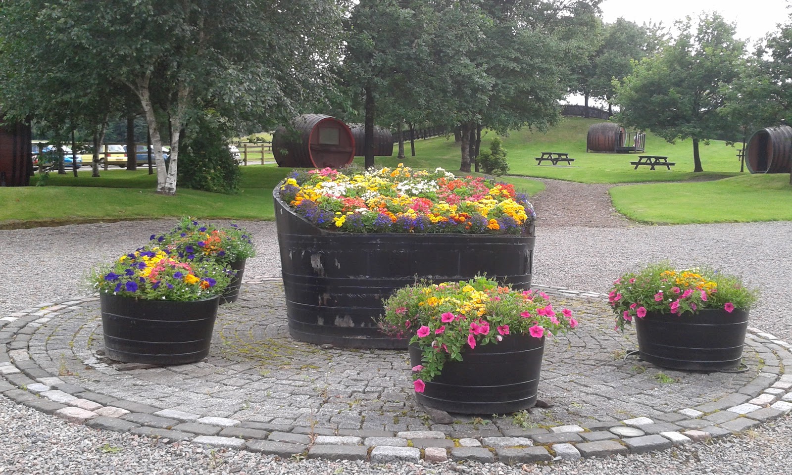 All around the town there is evidence of the whiskey industry including this mini still and flowers in whiskey barrels.