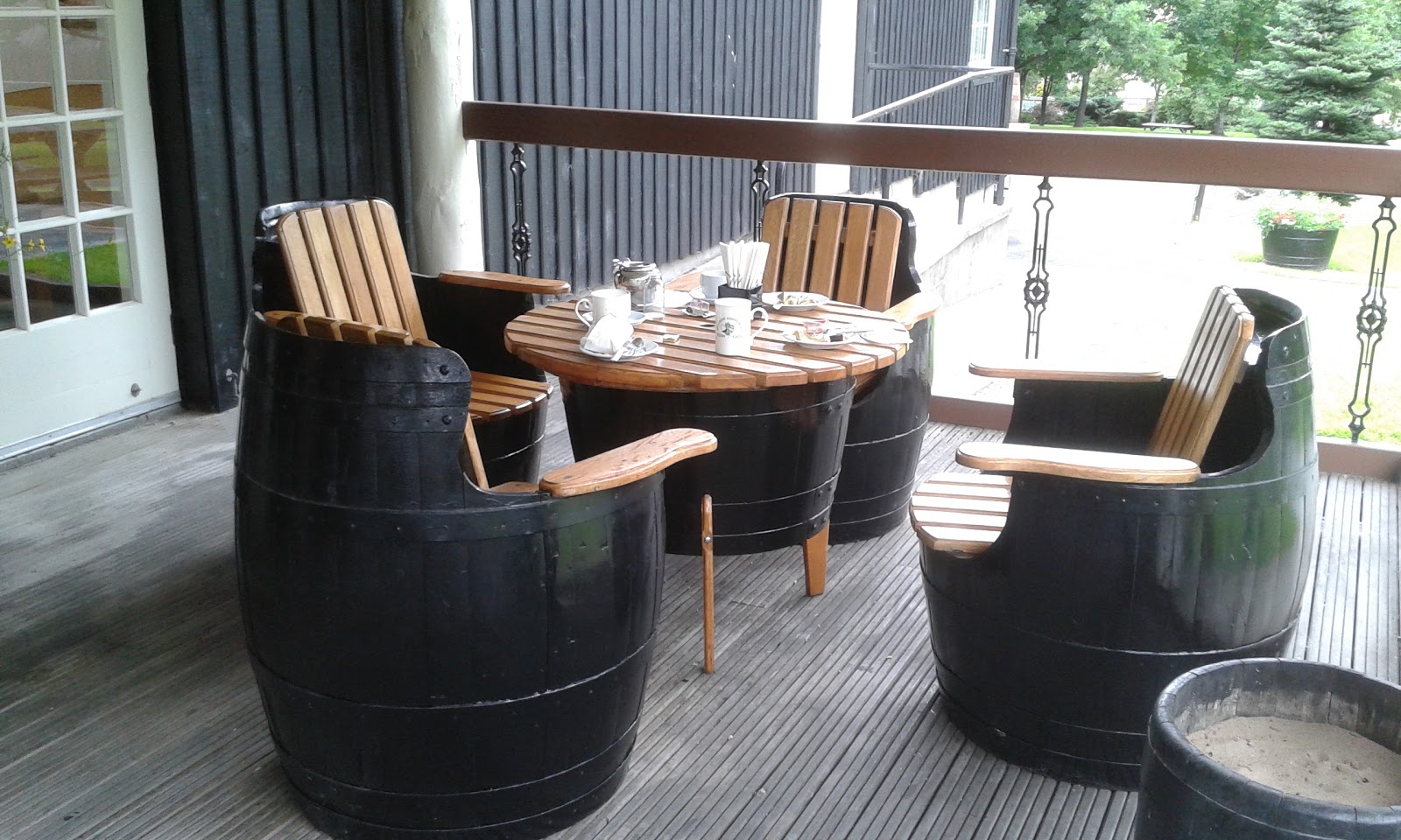 The decor in the cafe, both inside and out, was fabulous with seats and tables made out of old barrels.