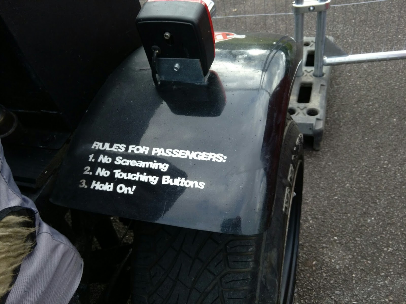 Above is the trike from earlier and below is the rules for passengers which is written on the wheel guard – I love the no screaming one.