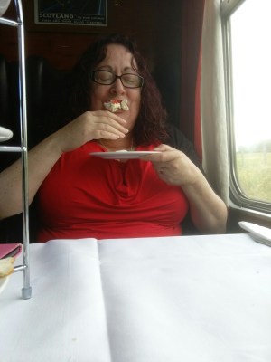 Now the next photo I’m putting in only to be fair to my beloved. I’m always using pictures of him where he may not be at his most glamorous, so here is one he took of me when he made me laugh just as I was taking a bite out of my meringue – he’s lucky I didn’t spray it all over him. He sat there taking constant pictures so there is a whole series of very funny photos.