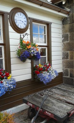 More lovely flowers with the old luggage trolley and great station clock.