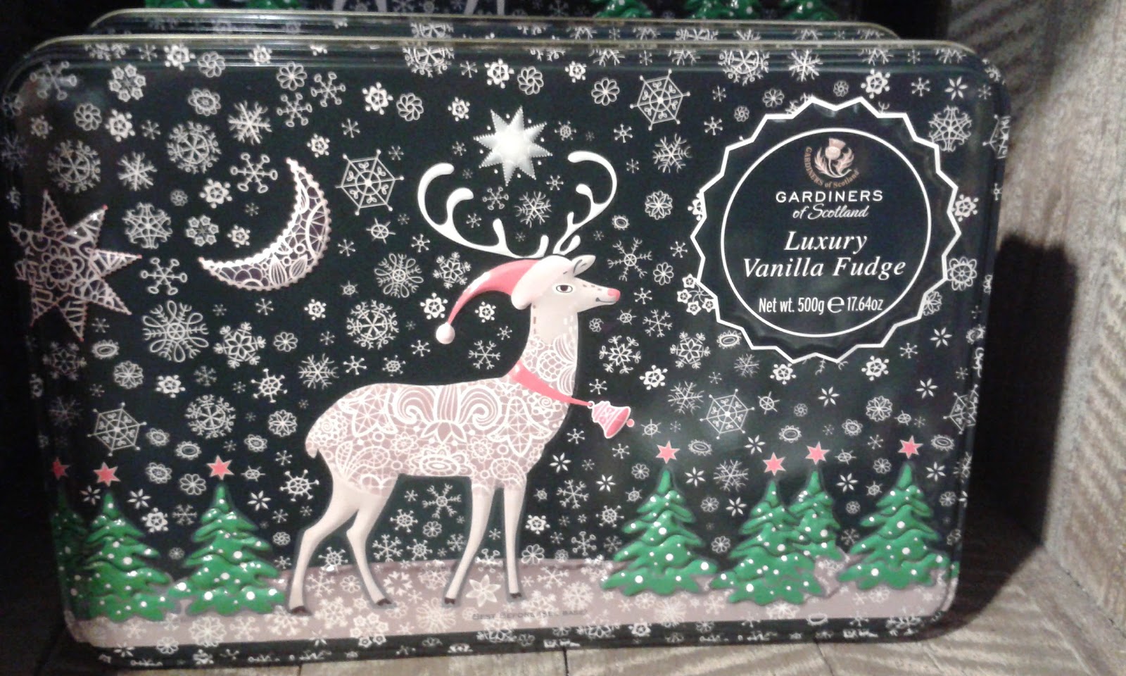 This tin of fudge is beautiful – love this design with the snow and the moon and stars around a reindeer.