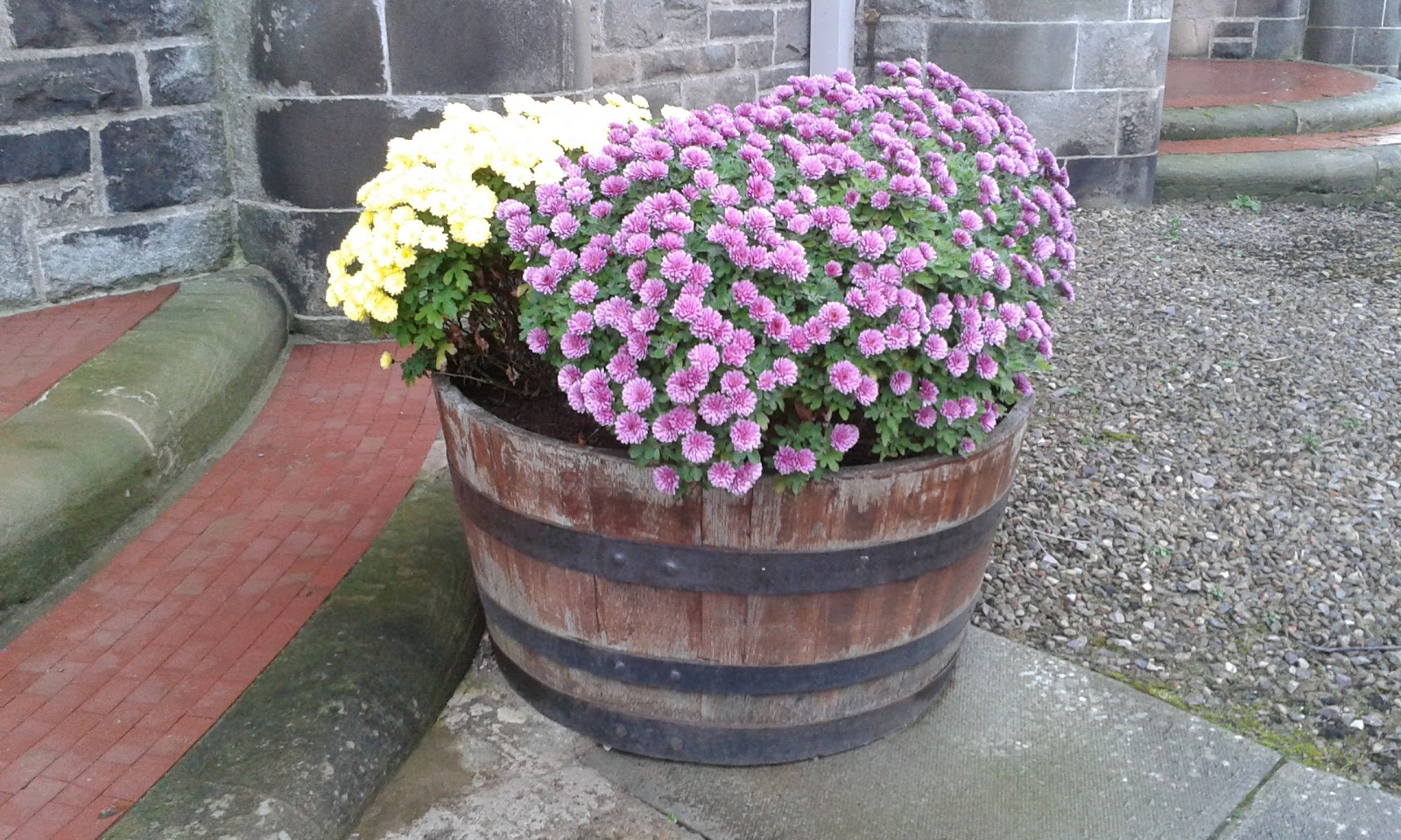 Beautiful flowers in a whiskey barrel at the front of the church.